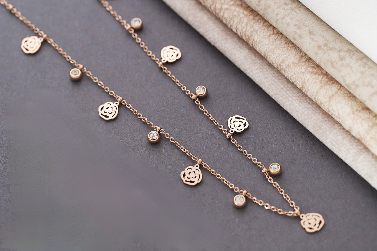 Introducing the Rosy Tanmaniya: a stunning piece of daily wear jewelry featuring a celebrity-inspired design. Made with 18k gold plating, this waterproof piece is both stylish and practical. Its adjustable size ensures the perfect fit for anyone, while its trendy rose gold color adds a touch of elegance to any outfit. Upgrade your wardrobe with this must-have accessory.